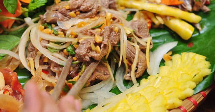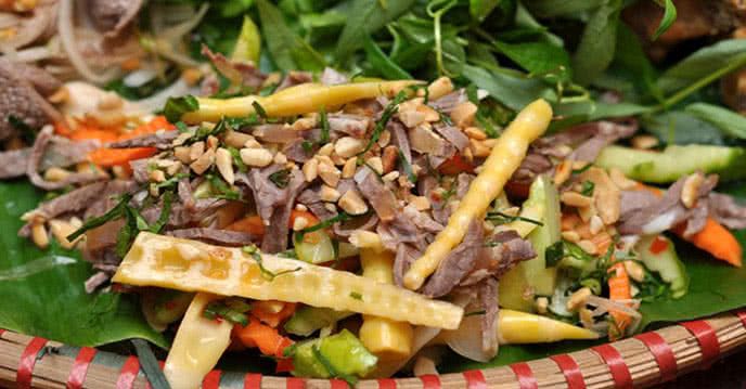 Sweet and sour beef bamboo shoot salad, with each forkful, you'll taste the tanginess of bamboo shoots blending with the tender, fragrant beef, the crunch of crushed peanuts, and the addition of finely sliced carrots and cucumbers. Enjoy it with rice or noodles for a delightful meal!