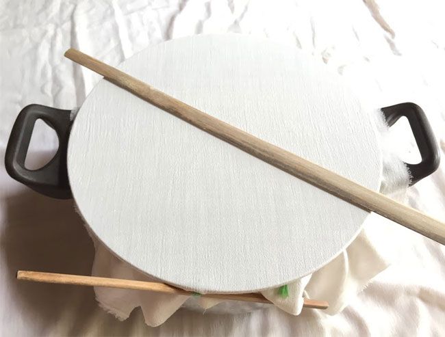 Step 4: Prepare the steaming pot by adding some water, cover the pot with a piece of cloth, secure it tightly with a string so that the cloth surface is taut and without wrinkles on top. Leave a gap of about 1 - 2 cm at one corner of the pot to allow steam to escape and cook faster.
