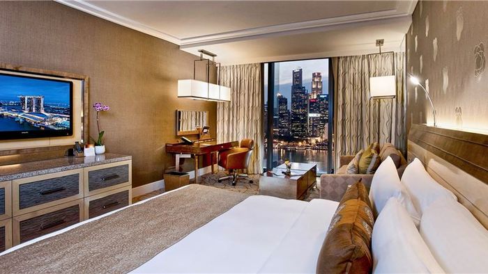 Accommodations at Marina Bay Sands Singapore are adorned with dark wood in a modern style, featuring carpeted floors and flat-screen cable TVs. Floor-to-ceiling windows offer panoramic views of Singapore's skyline.