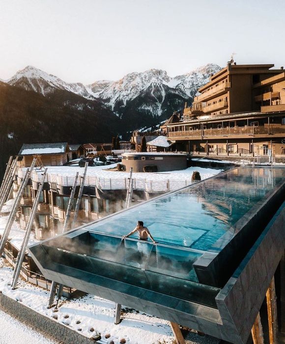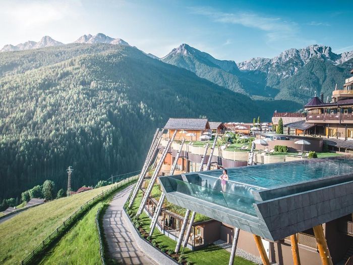 Not only boasting a tranquil atmosphere and breathtaking surrounding landscapes, Alpin Panorama Hotel Hubertus in South Tyrol, Italy, is also famous for its 28-meter-long, 12-meter-high infinity pool nestled against the mountain backdrop. This place is dubbed the world's scariest pool.