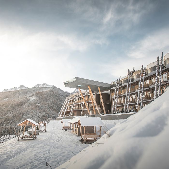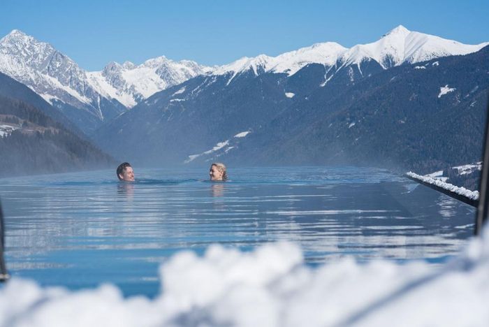 The infinity pool blends seamlessly into the surrounding mountainous forest space. Your vacation will be even more perfect by engaging in activities such as snowboarding, long walks, and soaking in the natural hot springs located here. Photo: Wanderhotels.