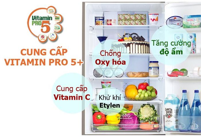The Vitamin Pro 5+ function ensures moisture balance, utilizes Ethylene gas removal to prevent wilting of vegetables, and provides Vitamin C to prevent food oxidation. Additionally, it has antibacterial and odor elimination properties to keep food fresh and safe.