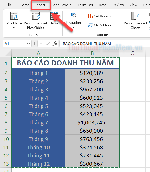 Step 1: To create a line chart in Excel, you need to select your data, then choose Insert.