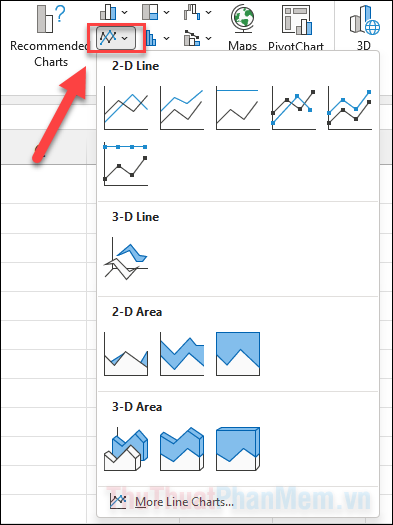 Step 2: Click on the Line Chart icon under the Charts section. Here, you can choose the type of chart you want to display, from 2D to 3D.