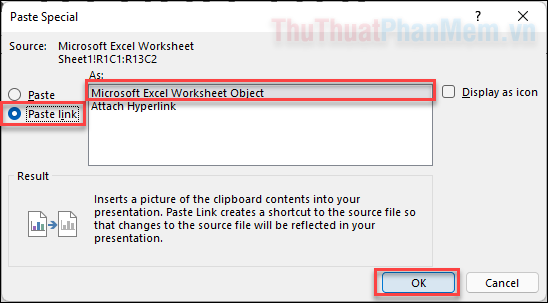 Step 4: Choose Paste link >> Microsoft Excel Worksheet Object >> OK.