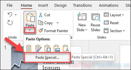 Step 3: Ensure you're on the Home tab in the ribbon menu. Click the downward arrow button under Paste >> select Paste Special...
