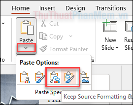 Step 5: Click on the arrow icon below Paste. Here, you can choose Use Destination Theme & Link Data (L) + Keep Source Formatting & Link Data (F). The first option allows you to use the current theme for the presentation. Meanwhile, the second option retains the layout of the source Excel file.