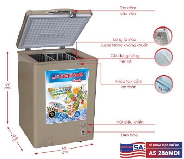 - Denver AS 286MDI Freezer: This freezer with 1 compartment and a capacity of 120 liters is suitable for small households, eateries, or small restaurants. The Denver AS 286MDI features an antimicrobial stainless steel interior coated with nano Ag+, uses 100% copper evaporator, saves up to 40% electricity compared to conventional aluminum evaporators, offers high durability, and operates quietly. Currently, a Denver AS 286MDI freezer is priced at 5,150,000 VND.
