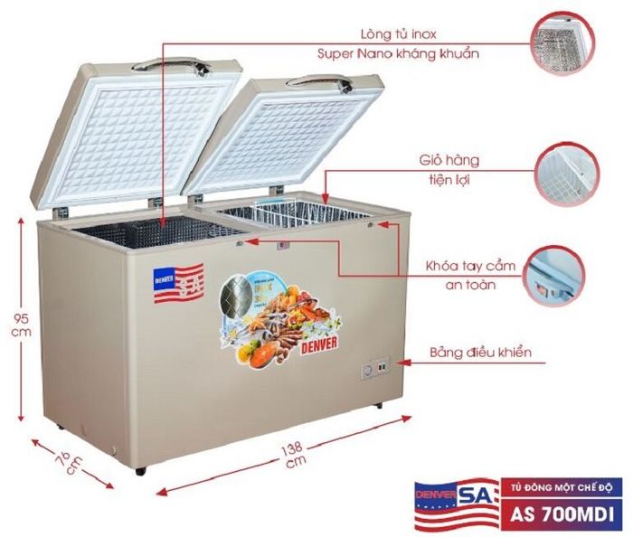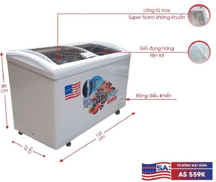 Denver AS 559K Freezer: This freezer belongs to Denver's curved glass lid display freezer series.- Denver AS 700MDI Freezer: This double-door freezer with 1 freezing compartment is imported whole. With a capacity of 500 liters, the freezer meets the storage and preservation needs of a large quantity of food. The thick cabinet, premium-grade stainless steel interior coated with silver nano, copper evaporator, R600a gas, Inverter technology integration, luxurious Gold-colored exterior,... Currently, a Denver AS 700MDI freezer is priced at 10,800,000 VND.