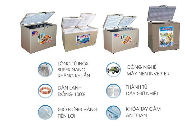 Denver freezers feature many outstanding and superior features that help with excellent food preservation and storage.- Stainless steel super nano antimicrobial interior: This is one of the most outstanding advantages of Denver freezer products that no other freezer type has. With the interior made of premium-grade stainless steel, coated with a Nano Ag+ layer, it ensures the best food preservation, ensuring food safety and consumer health. Additionally, this stainless steel material has high thermal conductivity, ensuring better food preservation, stable operation, and durability.