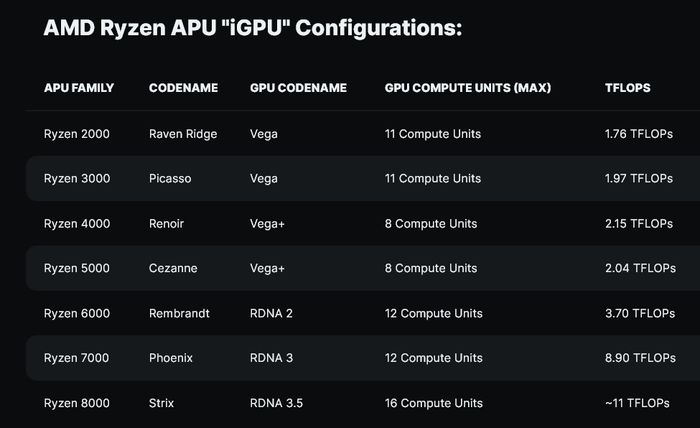 On the iGPU front, the AMD Ryzen 8000 'Strix Point' APUs will be configured with the AMD RDNA 3.5 GPU core, featuring 8 WGP (Working Group Processor) and a total of 16 compute units for a maximum of 1024 stream processors. The computational power of this iGPU is estimated to reach ~11 TFLOPs, equivalent to an RTX 3060, capable of handling all current AAA games.