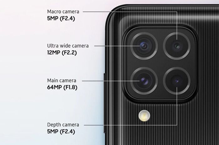 The Samsung Galaxy M62 features a quad rear camera setup consisting of a 64 MP primary camera, a 12 MP ultra-wide camera, and both a depth sensor and macro camera with 5 MP resolutions.