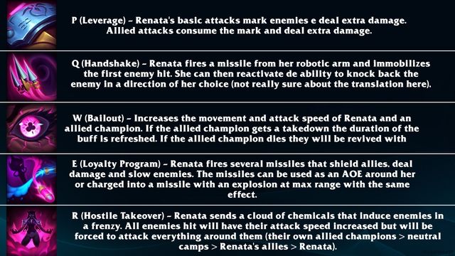 Furthermore, the (unconfirmed) skill set of Renata has been revealed. Renata will possess abilities geared towards strong crowd control against enemies and buffs for allies. Her passive, as leaked information suggests, will mark enemies, and when allies detonate the marks, they can deal damage. Renata's Q ability will inflict crowd control effects, enabling her to control opponents for a few seconds. Her W ability will also revive allies within 3 seconds. Her E ability will cause two different crowd control effects, while Renata's ultimate will unleash a wide-reaching taunt effect, forcing nearby enemies to attack the target directly in front of them (including her own allies, minions, and enemies). If there are no enemies nearby, those affected by Renata's ultimate can even attack the terrain in front of them.