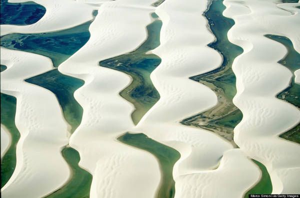 Viewed from above, Lençóis Maranhenses resembles a paradise with its smooth white sand dunes intertwining with emerald green or sapphire blue freshwater lagoons shimmering under the sun.