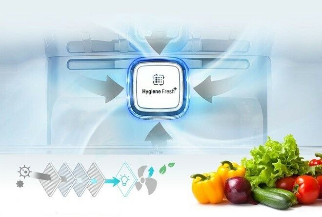 Prioritizing user health and aiming to provide a clean, bacteria-free environment, LG equips many new refrigerator models with the Hygiene Fresh+ antibacterial technology. Hygiene Fresh+ is a breakthrough technology that eliminates 99.99% of bacteria, as tested by Intertek - a reputable global quality testing organization. The filter includes 5 layers: dust filter, bacteria filter, virus filter, activated carbon odor filter, and UV light emitter, combined with a fan to circulate filtered air deeply into every corner of the refrigerator.