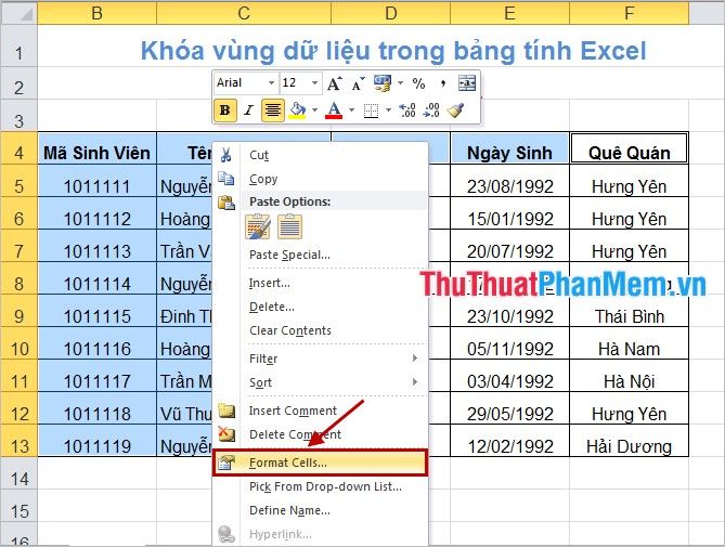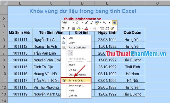Step 2: Choose the data range you want to lock, then right-click and select Format Cells.