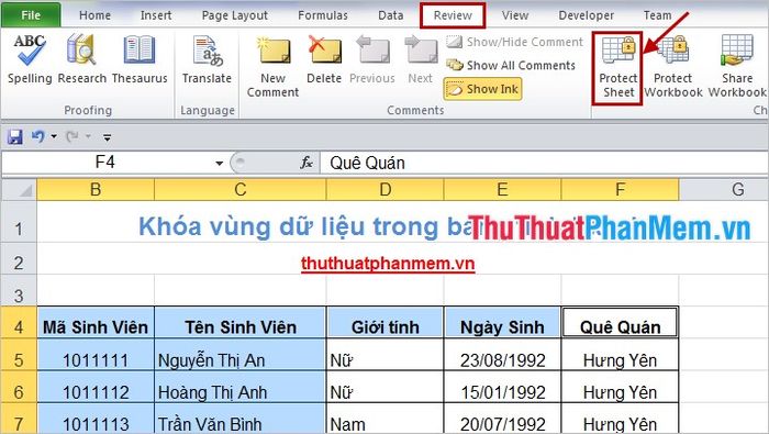 Step 3: You can select the Review tab -> Protect Sheet (or Home -> Format -> Protect Sheet).
