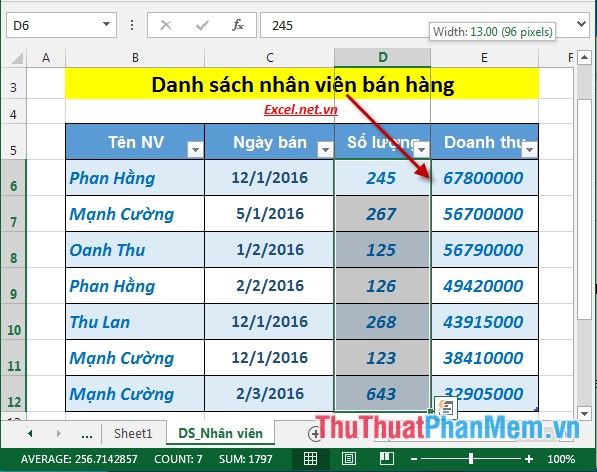 - The Column width dialog box appears, enter the width of the column in the Column width section -> OK: