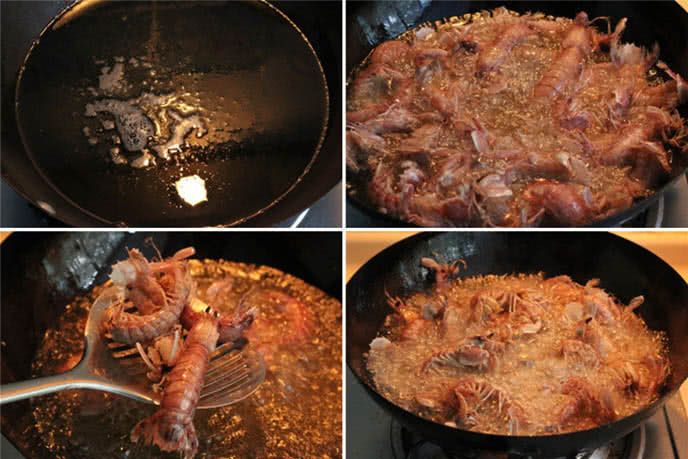 - Quickly place the mantis shrimp into the boiling oil, fry for about 2-3 minutes, then scoop them into a small mesh sieve to drain excess oil and turn off the stove.