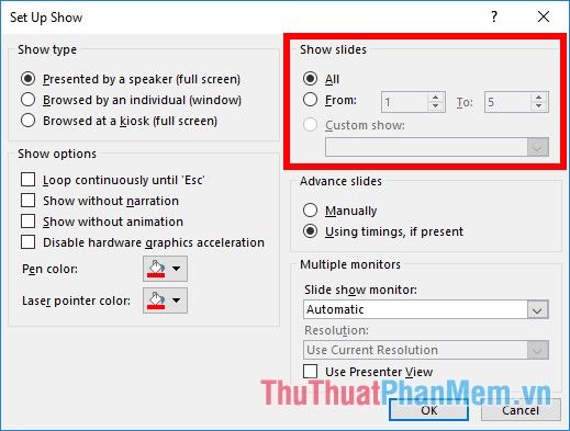In the Show slides section, you can opt for the default to showcase all pages (All), or selectively present specific pages by choosing From and selecting the desired page positions.