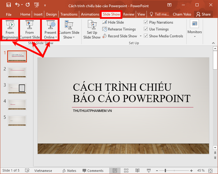 To commence your presentation journey, navigate to the Slide Show tab under Start Slide Show on the Powerpoint interface. Choose from three presentation options: From Beginning or press F5 (for a start from the first slide); From Current Slide or use the shortcut Shift + F5 (for presenting from the current slide); Present Online (ideal for remote audiences).