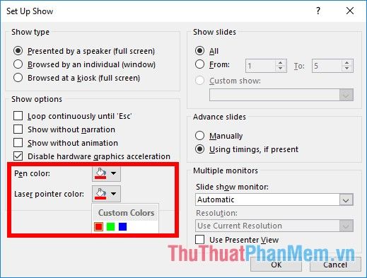 In the Set Up Show dialog, choose your preferred color for Pen or Laser Pointer in the Pen color or Laser pointer color section.