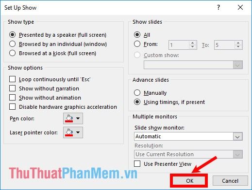 - Loop continuously until ‘Esc’: continuously loop the presentation until you press ESC.