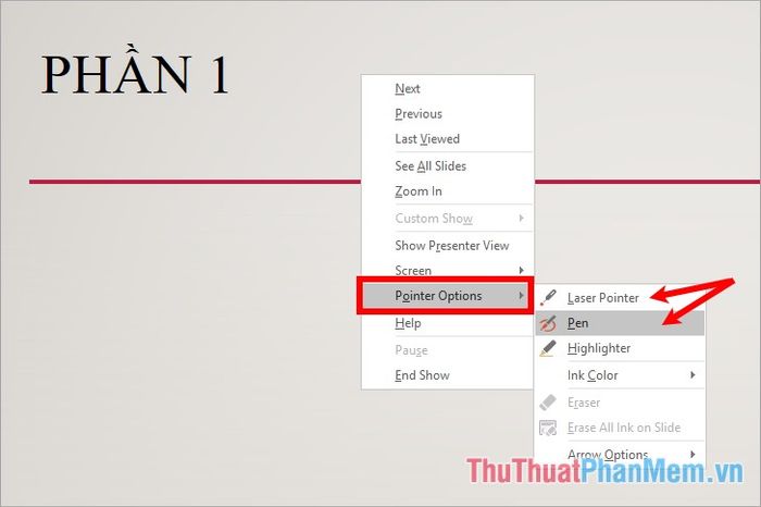 During the presentation, utilize the pen or laser pointer by right-clicking and selecting Pointer Options -> or choosing Laser Pointer or Pen.