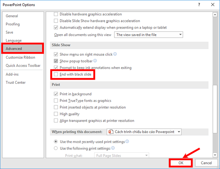By default, the concluding slide is black. Customize this by selecting File -> Options. In the PowerPoint Options, navigate to the Advanced tab, scroll down to Slide Show, and uncheck End with black slide -> OK.