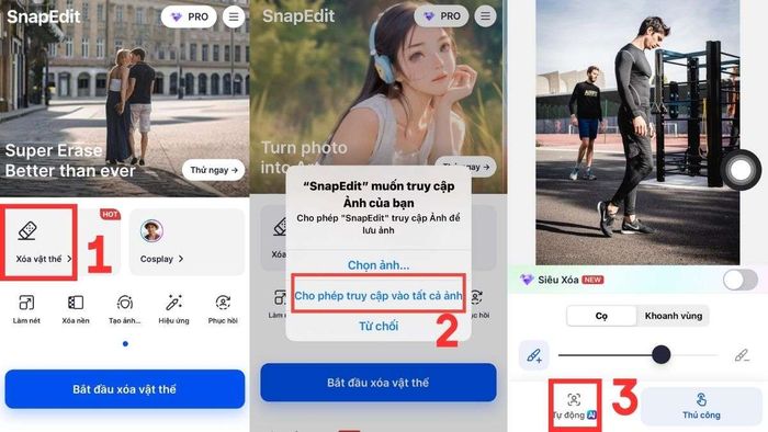 Log in to the SnapEdit app > Upload the image you want to edit > Choose to remove objects with AI or manually > Select the area/object to be removed in the image > Erase.