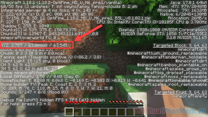 The XYZ line will display coordinates at your position, where X represents East-West direction, Y is the height, and Z indicates North-South direction.