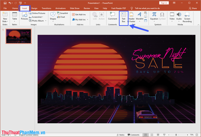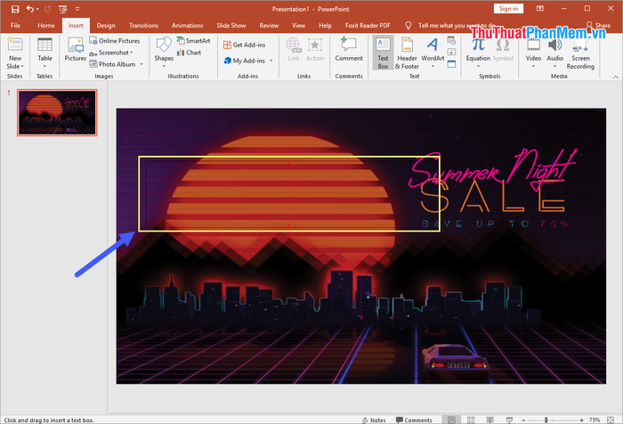 Step 2: After inserting the image into the PowerPoint file, select the Insert tab and choose Text Box to write text onto the image.