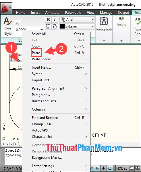 Step 3: Right-click at the insertion point for the phi character (1) => Paste (2) or press the Ctrl + V key combination to insert the phi character.