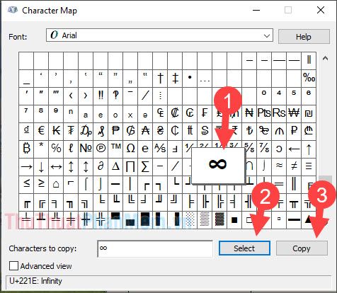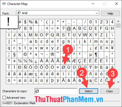 Step 1: Open the Character Map (as instructed in section 1.3). Then, select the character you want to insert (1) => Select (2) => Copy (3).