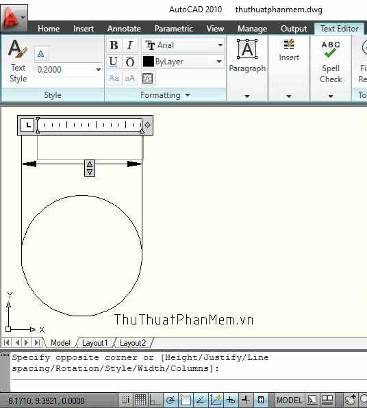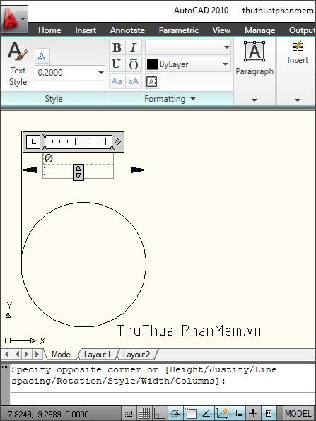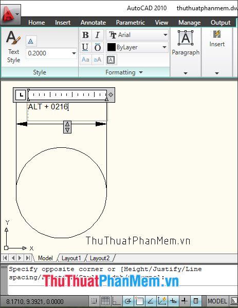Step 2: Click to select the starting point (1) and encircle to define point 2 (2) to create an area for inserting text, characters.