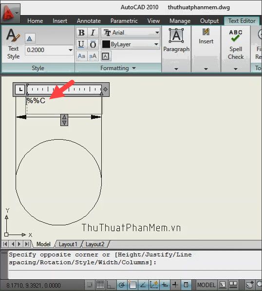 - Create an MText field as instructed above and input the character sequence %%C (write continuously, C is not capitalized).
