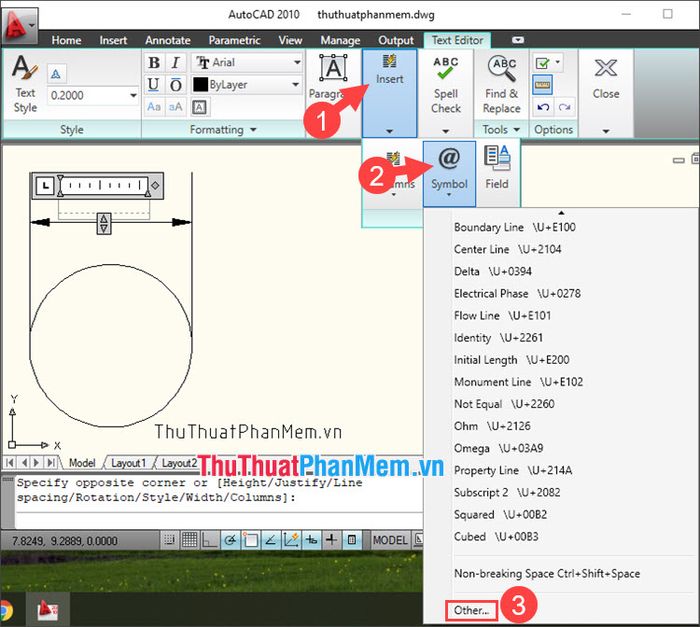 Step 1: Create an MText box and click on the Insert (1) menu => Symbol (2) => Other… (3).