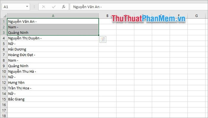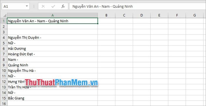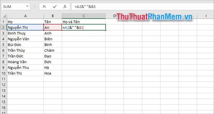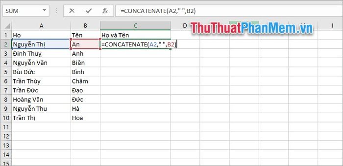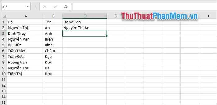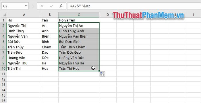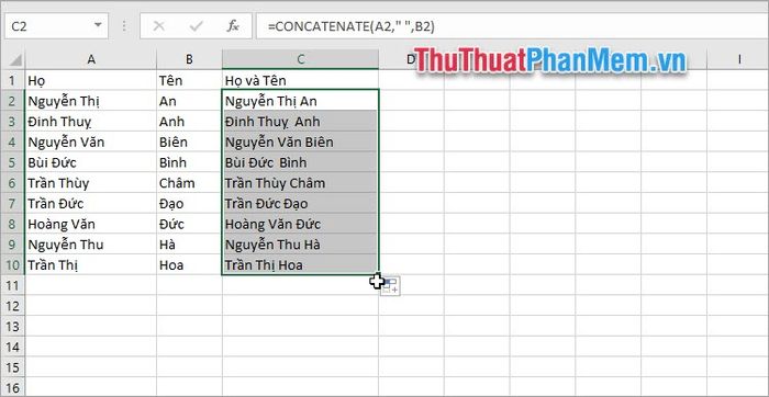 Step 2: Drag the mouse to copy the formula down to the rows below to merge columns, you will get the following result.