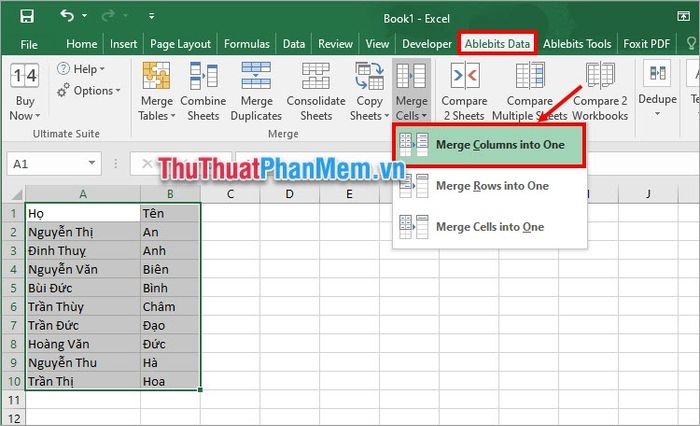 Step 2: Choose the Ablebits Data tab, select Merge Cells, where you have 3 merging options to choose from: