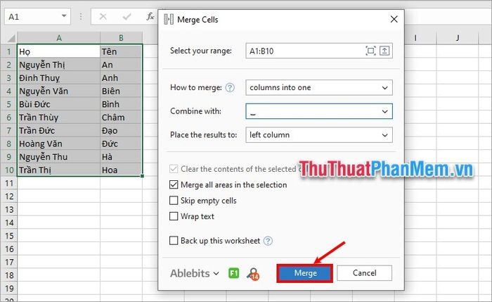 Step 3: The Merge Cells dialog box appears, where you can set up the options as desired.