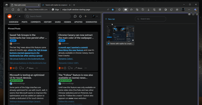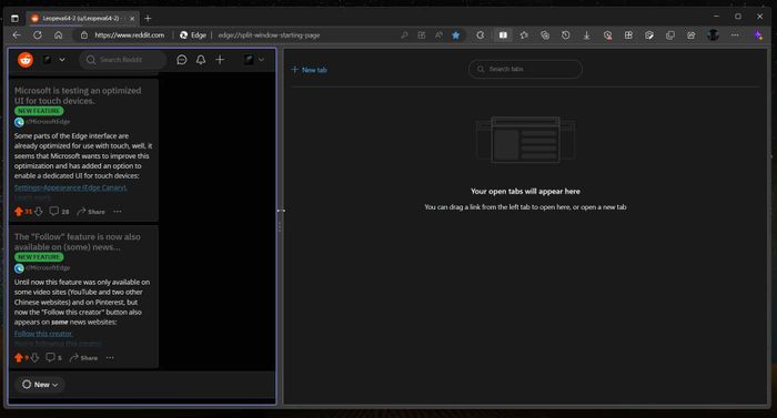 The feature called Split window is currently undergoing testing on the Edge Canary version. When activated, a new button will appear next to the address bar allowing you to split the Edge window into 2 windows containing separate tabs, thereby enabling you to browse two web pages simultaneously.