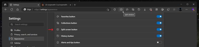 Restarting Edge will add a Split window button, resembling a divided window, near the address bar. This setting will also be available in Settings > Appearance of Edge.