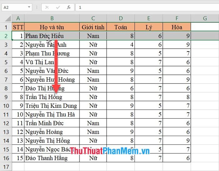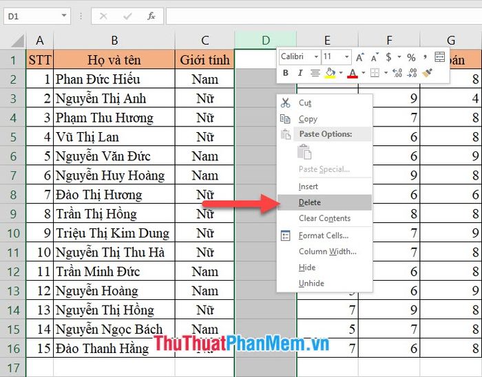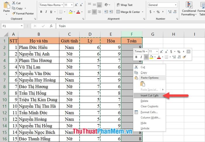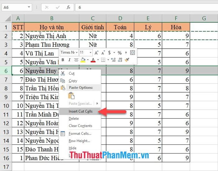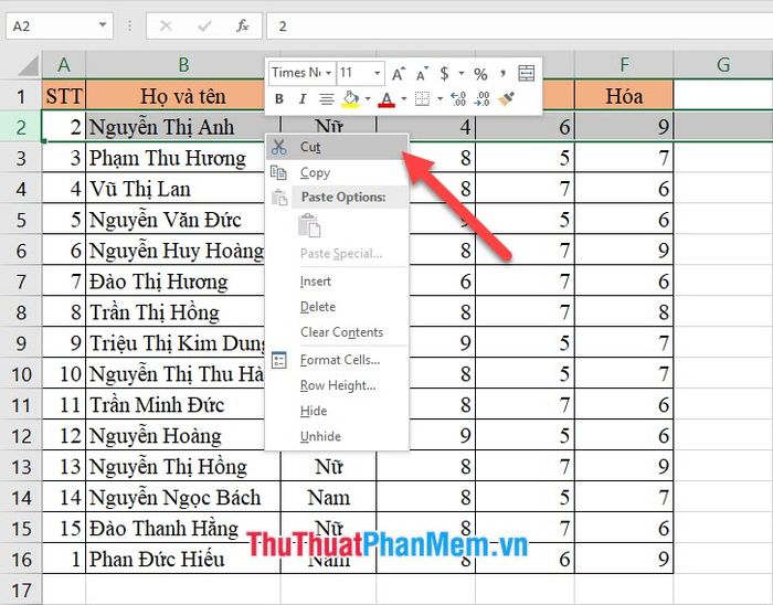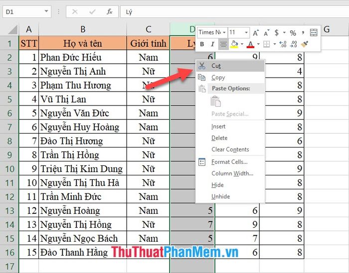 Next, right-click on the selected data range and choose Cut from the displayed options menu. Alternatively, you can use the shortcut Ctrl + X to perform the same function.