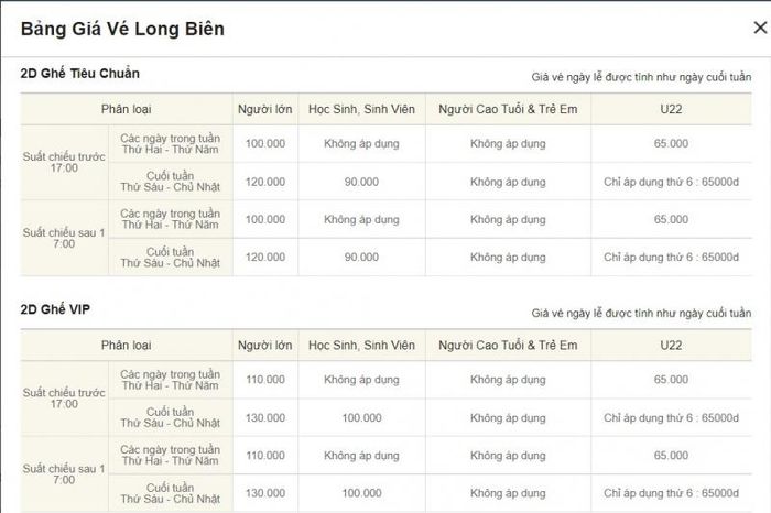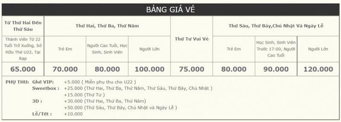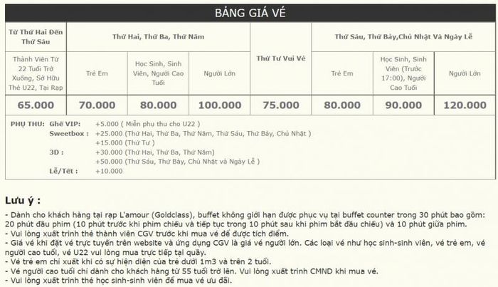 Ticket prices at CGV vary depending on the audience, time, and seat location. From Monday to Friday, ticket prices range from 75,000 VND to 100,000 VND for standard seats. On weekends, ticket prices fluctuate from 80,000 VND to 120,000 VND. Currently, there's a special offer for members aged 22 and below, with tickets priced at 65,000 VND.