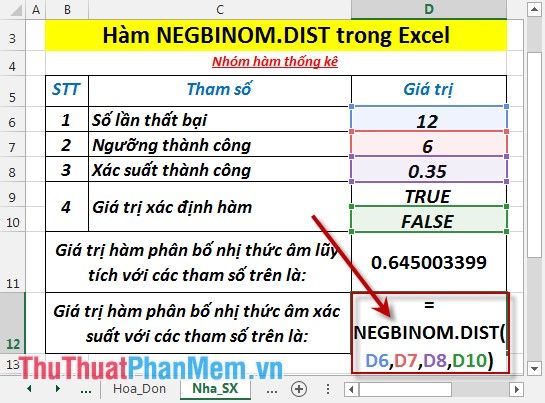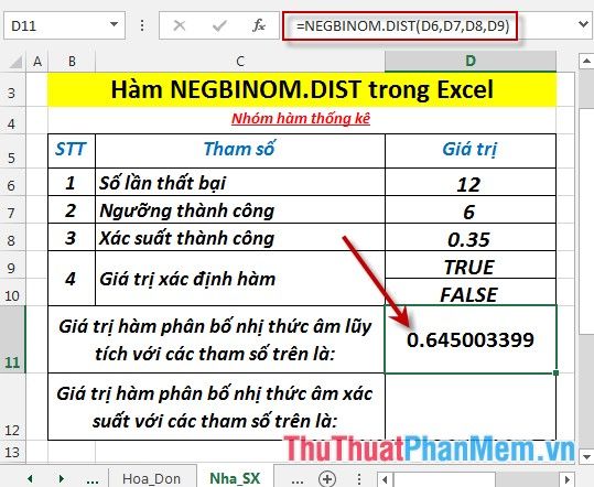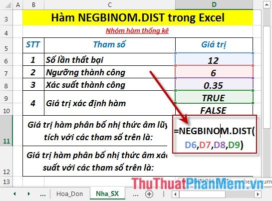 - Calculate the cumulative negative binomial distribution (corresponding to the value True). In the cell where you want to calculate, enter the formula: =NEGBINOM.DIST(D6,D7,D8,D9)