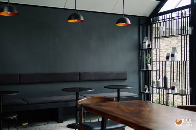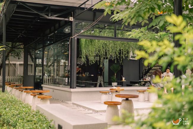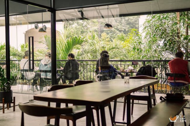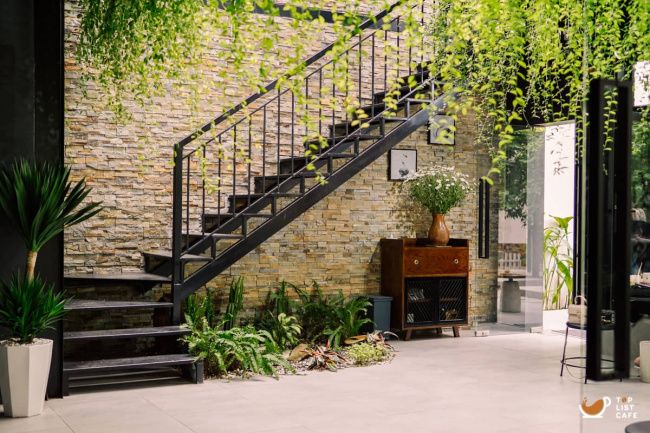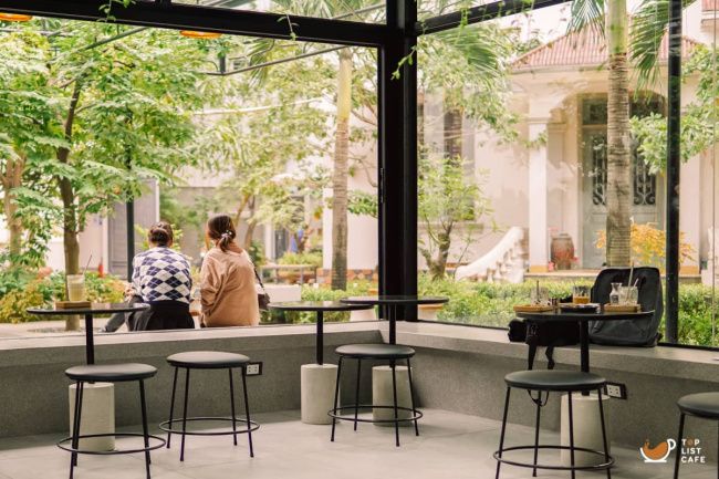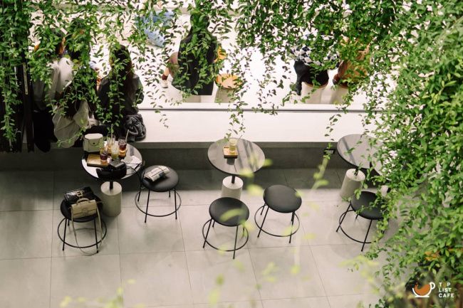 Apart from the concrete courtyard interspersed with clean white pebbles, the operational space of the café also includes two floors inside. The highlight of the indoor space is the greenhouse-inspired design, with a skylight featuring cascading leaves like a refreshing green curtain, very fitting and pleasing to the eye.
