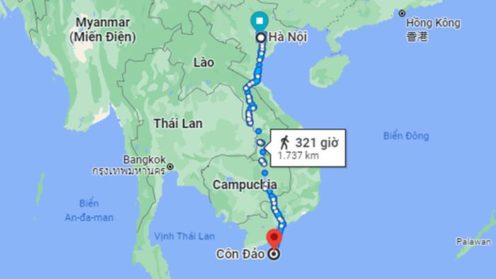 As per Mytour's latest findings, the air distance from Hanoi to Con Dao is roughly 1390 km, covering airspace over Laos and Cambodia.