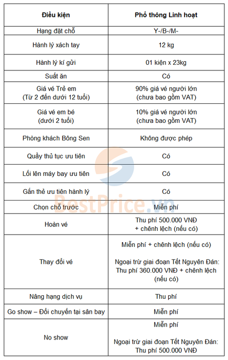 Examining the differences between Vietnam Airlines ticket classes, it's evident that the Flexible Economy Ticket offers very flexible refund/cancellation/exchange conditions, aligning with its name. You can find detailed information in the following table: