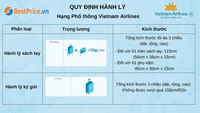 To avoid excess baggage fees or being denied transportation, your baggage dimensions and weight must comply with Vietnam Airlines' baggage regulations: