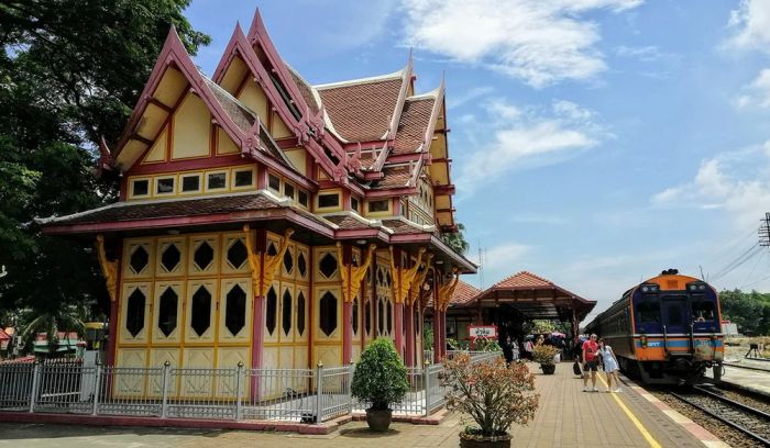 Built in 1921 to connect Bangkok to southern Thailand, Hua Hin Railway Station still retains its ancient and unique architecture. The station impresses visitors with its vibrant colors; from a distance, you can see the red-tiled roofs and pillars, creating the distinctive character of this railway station.